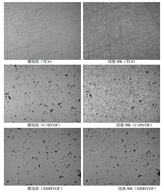 由上圖可看出,浸泡90h后,TC4鈦合金發(fā)生較為嚴(yán)重的腐蝕,C+HVOF涂層發(fā)生輕微腐蝕,X80HVOF涂層未發(fā)生腐蝕。